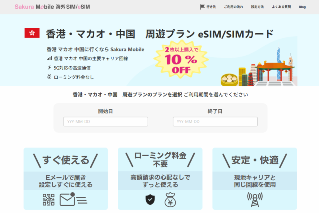 香港旅行用に、さくらモバイルの香港・マカオ・中国周遊プランeSIMをぜひ検討してみてください。